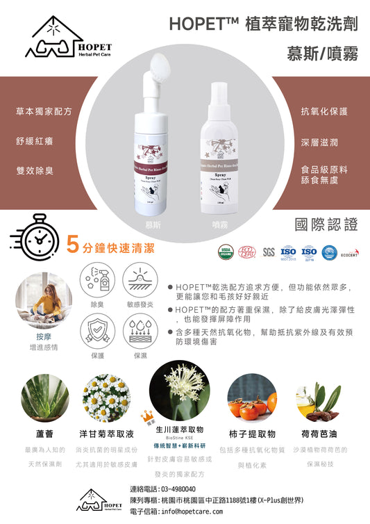 HOPET Organic Herbal Pet Rinse-Free Bath Mousse for Dogs & Cats 150ml