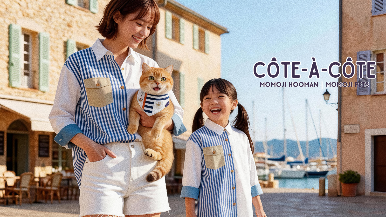 Marking Momoji's 10th anniversary, the côte-à-côte collection redefines human-pet companionship through high-end maritime streetwear. Inspired by the French coast, this series features architectural silhouettes and a sophisticated low-saturation palette of Salt White and Midnight Navy. From avant-garde oversized shirts to "pet couture" neckwear, we invite you and your beloved companion to navigate a new, synchronized lifestyle. Navigate life together, always côte-à-côte.